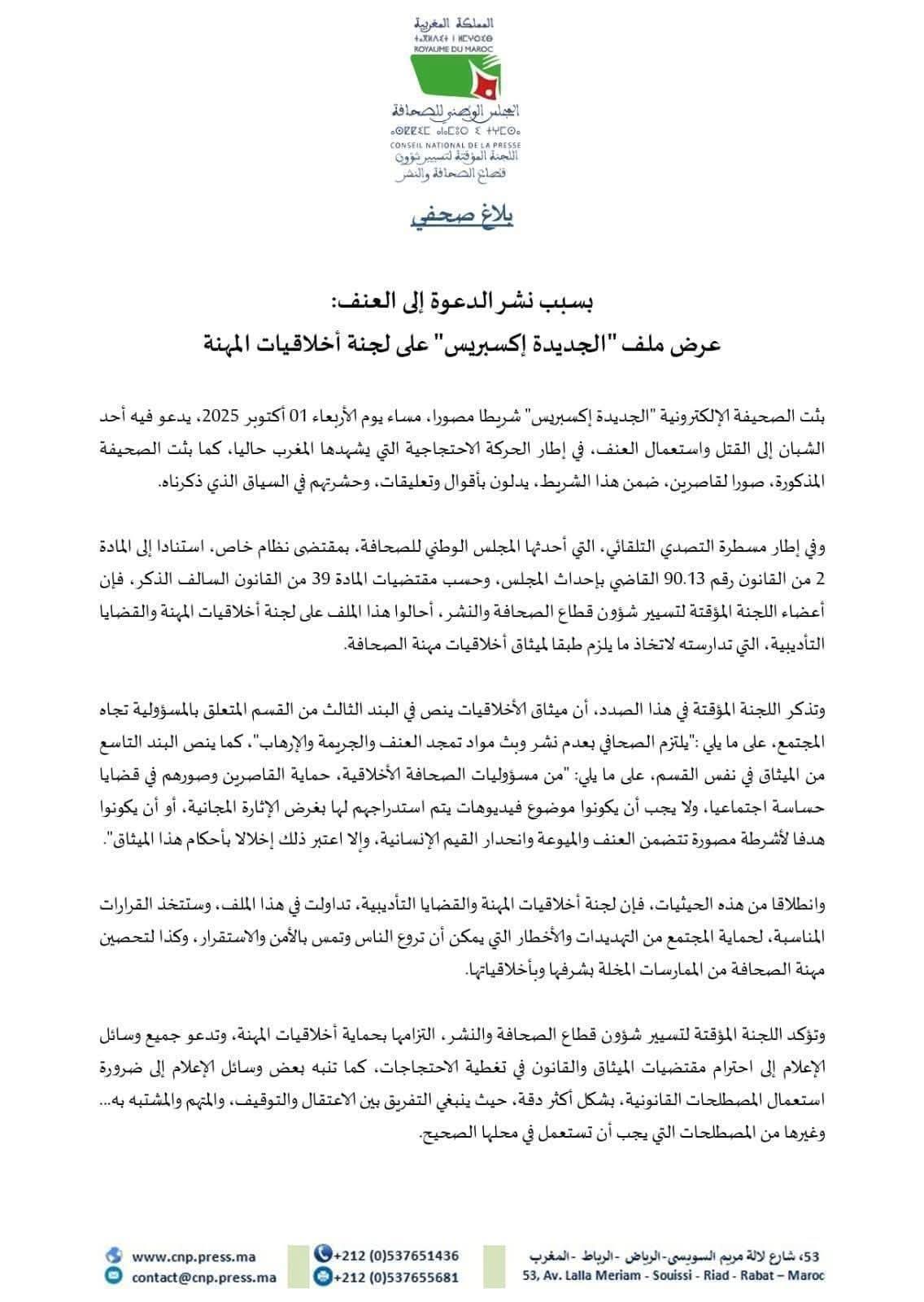 أحال المجلس الوطني للصحافة، عبر لجنته المؤقتة لتسيير شؤون القطاع، ملف الصحيفة الإلكترونية “الجديدة إكسبريس” على لجنة أخلاقيات المهنة والقضايا التأديبية، على خلفية نشرها شريطا مصورا تضمن دعوات صريحة إلى القتل واستعمال العنف في سياق الاحتجاجات الأخيرة.