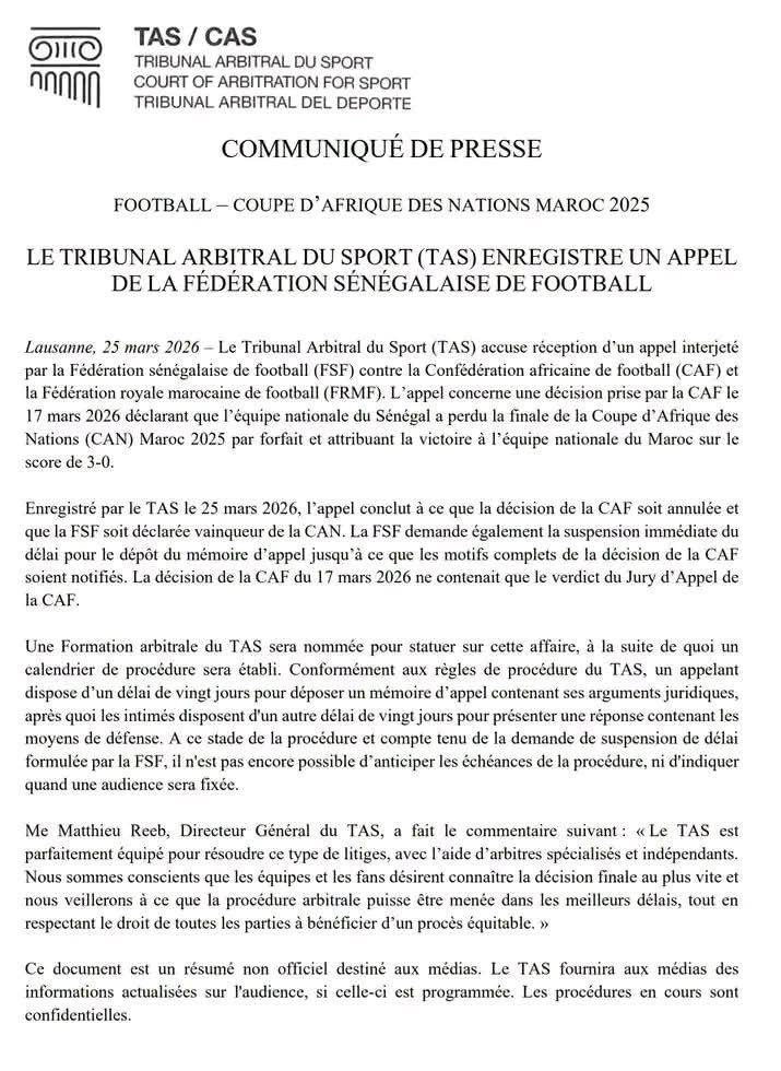 وفي السياق ذاته، طلب الاتحاد السنغالي تعليق الآجال القانونية المتعلقة بتقديم مذكرة الاستئناف، إلى حين التوصل بالحيثيات الكاملة للقرار، وهو ما يجعل تحديد موعد الجلسة أو الجدول الزمني النهائي للإجراءات أمرا غير ممكن في المرحلة الحالية.