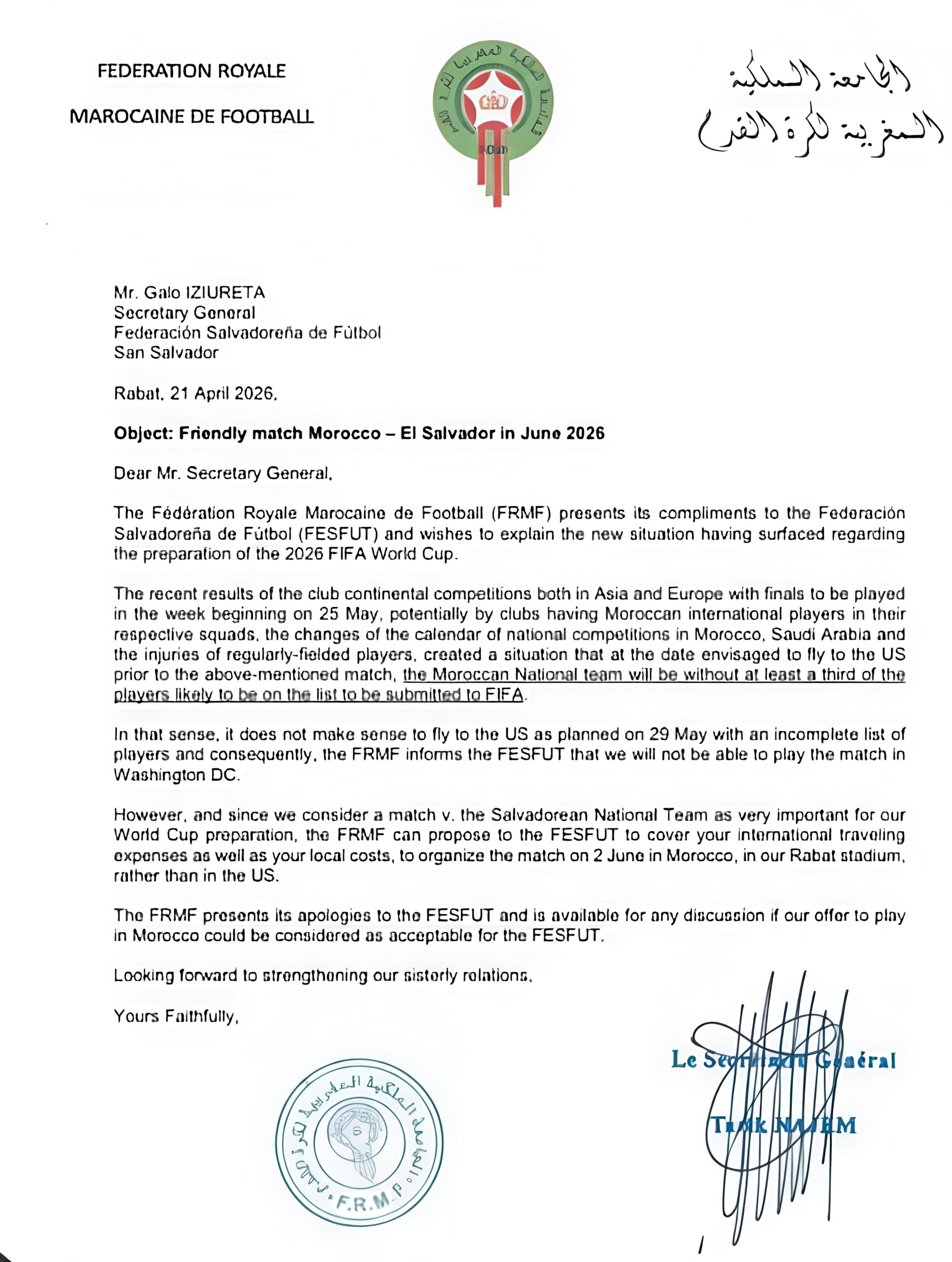 كشف رئيس الاتحاد السلفادوري لكرة القدم، ياميل بوكيلي، أن منتخب بلاده توصل بمراسلة رسمية من الجامعة الملكية المغربية لكرة القدم تفيد بعدم قدرة المنتخب المغربي على خوض المباراة الودية التي كانت مبرمجة بين الطرفين يوم 3 يونيو المقبل بولاية ميريلاند الأمريكية.
