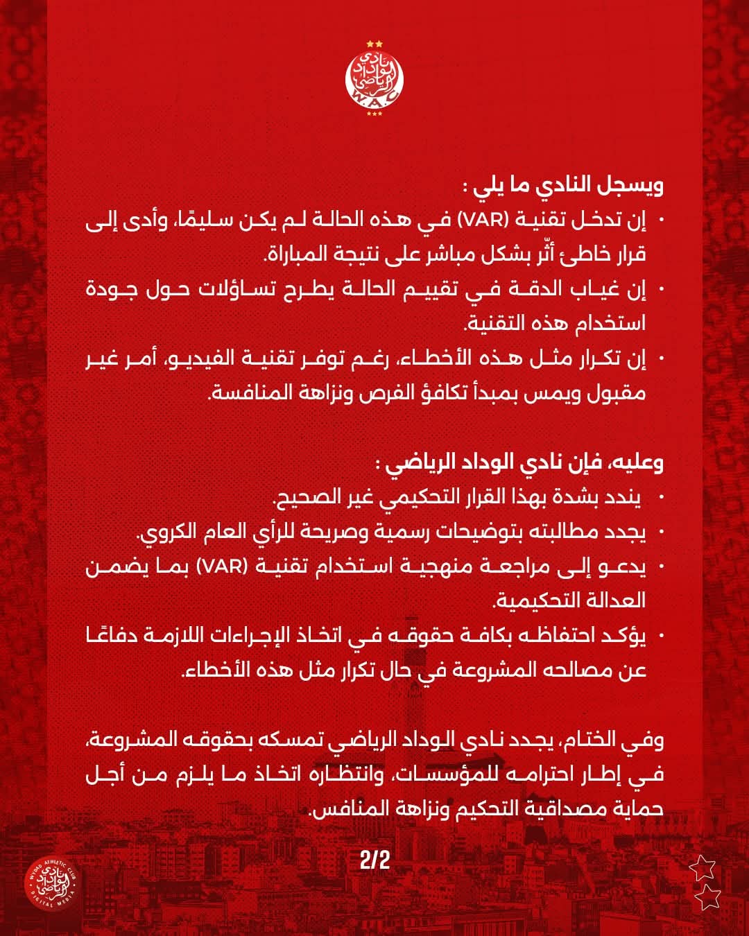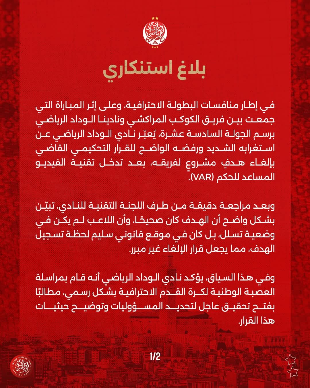 أعرب نادي الوداد الرياضي عن استغرابه الشديد ورفضه للقرار التحكيمي القاضي بإلغاء هدف اعتبره مشروعا، بعد تدخل تقنية الفيديو المساعد للحكم، خلال المواجهة التي جمعته بفريق الكوكب المراكشي، برسم الجولة السادسة عشرة من البطولة الاحترافية.